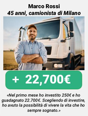 Sì, è successo, sono riuscito a iscrivermi al programma e ora guadagno passivamente 2000 euro al mese, prelevo i profitti una volta alla settimana, mangio deliziosamente e mi rilassò. Questo è quello che volevo, controllo il processo dal mio telefono, e sempre in contatto con il vostro manager. Questa piattaforma è qualcosa di straordinario.